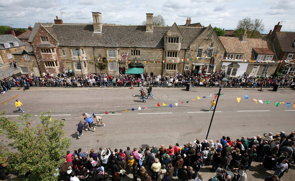 It would be nice to be able to say that the event is "as old as the village" or that it's origins have been lost in "the mists of time" but really no one knows how far back the tradition of rolling the cheeses goes. Midway through the Twentieth Century, when the village had turned into rather a quiet place having been by-passed by the A1 and the inns and businesses had seen a big drop in their trade, a landlord of one of the pubs decided to revive an ancient tradition. Or so he told everyone! He could be seen rolling a Stilton Cheese along the road outside his pub. People came to stand and watch and eventually joined in. And so the sport began - again.